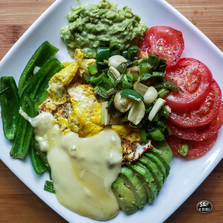 The Art of Breakfast. Another entry in my ongoing series, photographed in the Tazewell Green kitchen Sunday morning, April 26, 2020. (SKip Rowland)Featuring jalapenos, scallions, garlic, eggs, Gouda, tomato, avocado, ground rock salt with cumin, ground black pepper, turmeric, and shawarma seasoning.